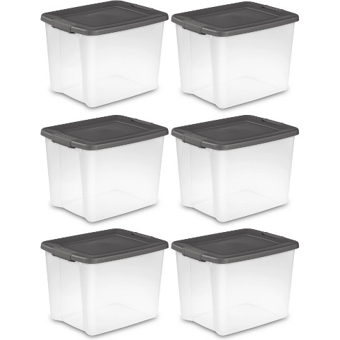 Sterilite ultra clear storage bin with gray lid.